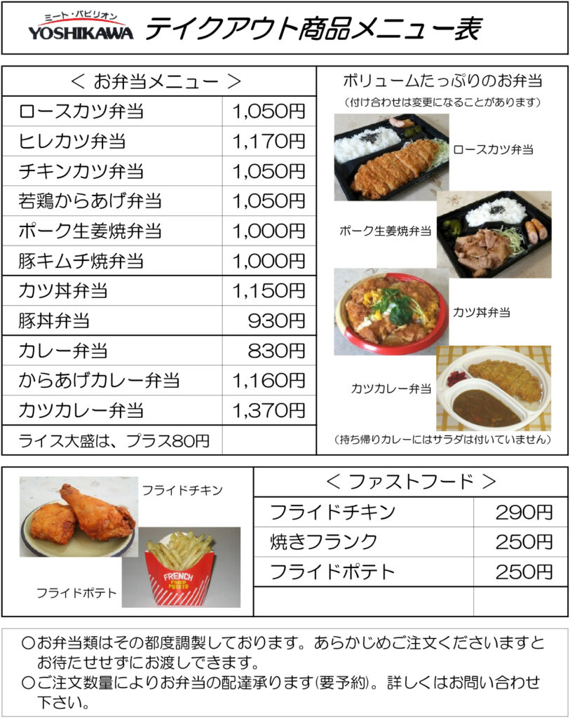 ショップ・レストラン ミートパビリオンのテイクアウトメニュー ボリュームたっぷりの特製弁当をはじめ、店内揚げたてのフライドチキンなどファストフードもご用意!食肉専門店の味をご家庭でお召し上がりください。